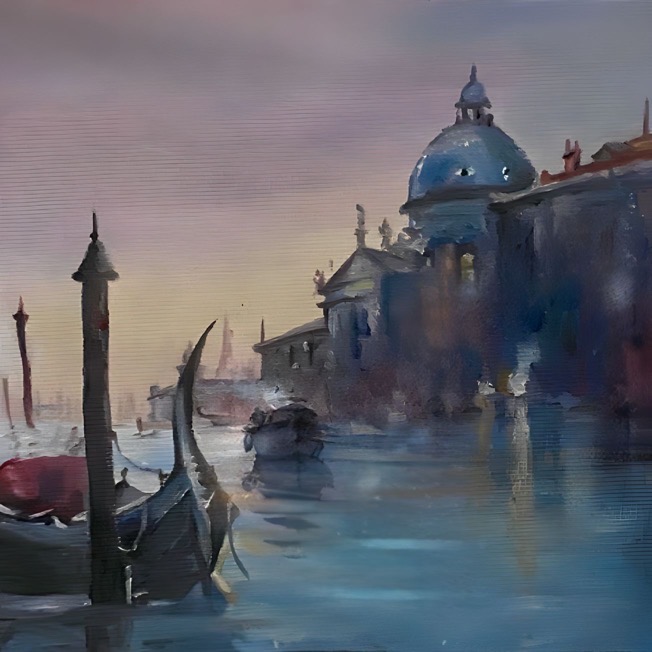 Los tonos suaves y la luz dorada aportan una sensación de calma y misterio, invitando al espectador a sumergirse en esta experiencia visual. En conjunto, la obra transmite una sensación de admiración por la belleza de Venecia y la posibilidad de encontrar el romance en cada rincón de esta ciudad mágica.